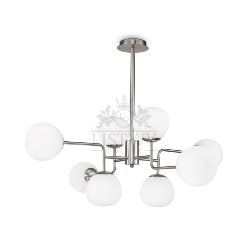 Lampa wisząca Erich MOD221‑PL‑08‑N (nikiel) od Maytoni to wyrafinowana i nowoczesna oprawa świetlna, która dodaje przestrzeni elegancji i lekkości. Jej konstrukcja składa się z metalowej ramy w odcieniu niklu oraz ośmiu kulistych kloszy z dmuchanego, mlecznego szkła, tworzących „molekularny” układ, który przyciąga wzrok i stanowi dekoracyjny akcent.