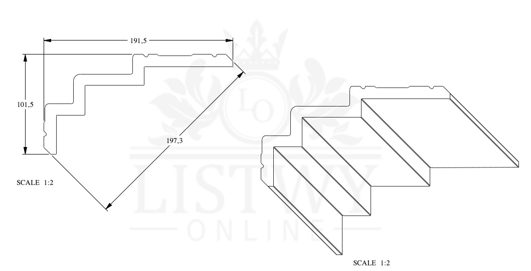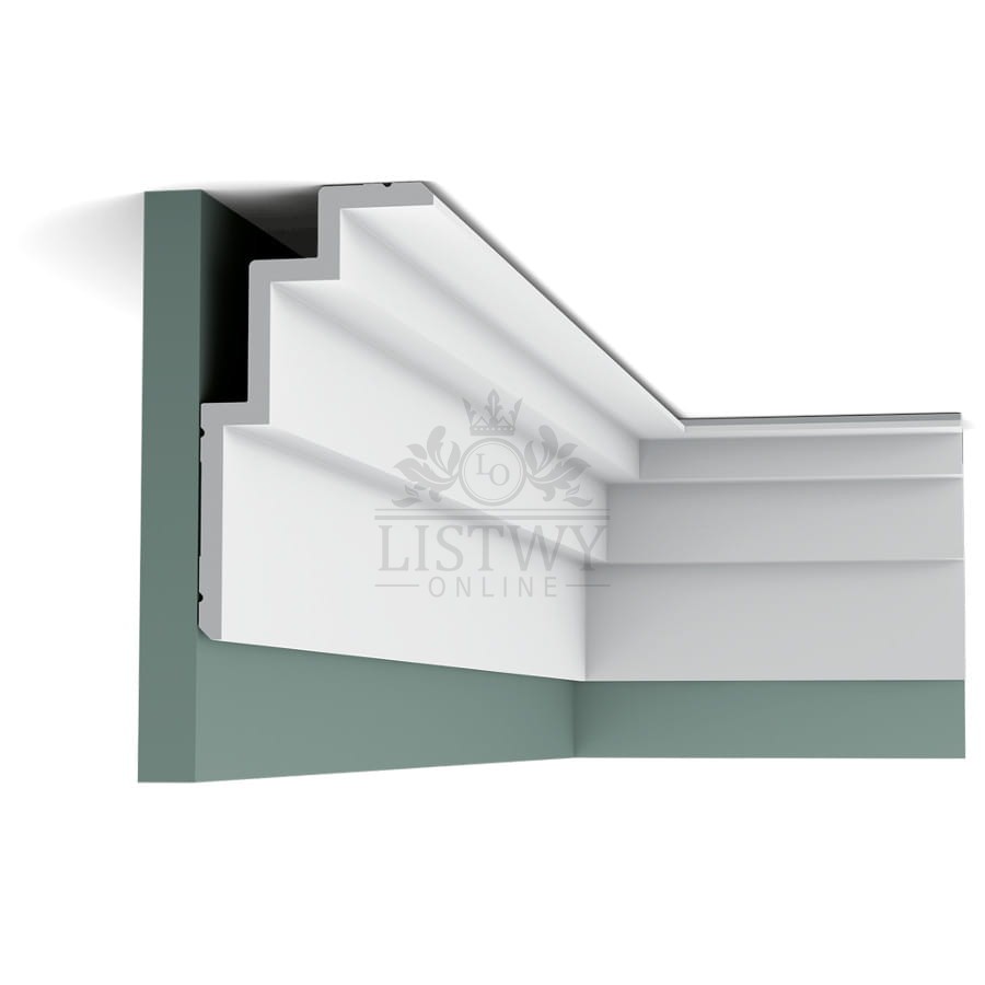 Elegancki profil wielofunkcyjny C392. Może być użyty jako nowoczesny gzyms, listwa karniszowa lub element oświetlenia LED. Ścięte rogi na górze i dole gzymsu mogą tworzyć subtelną linię podkreślającą wzór liniowy.
