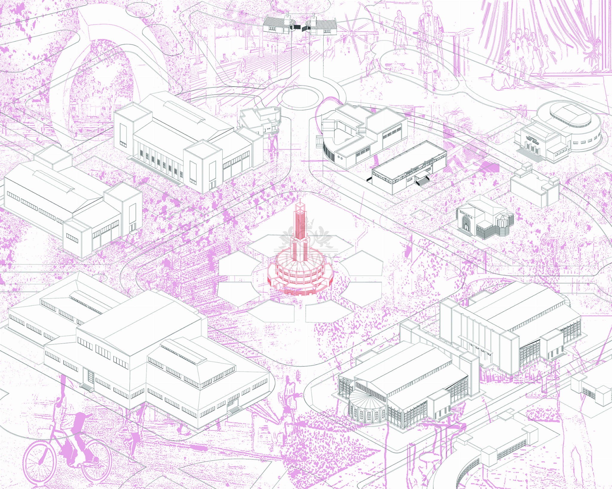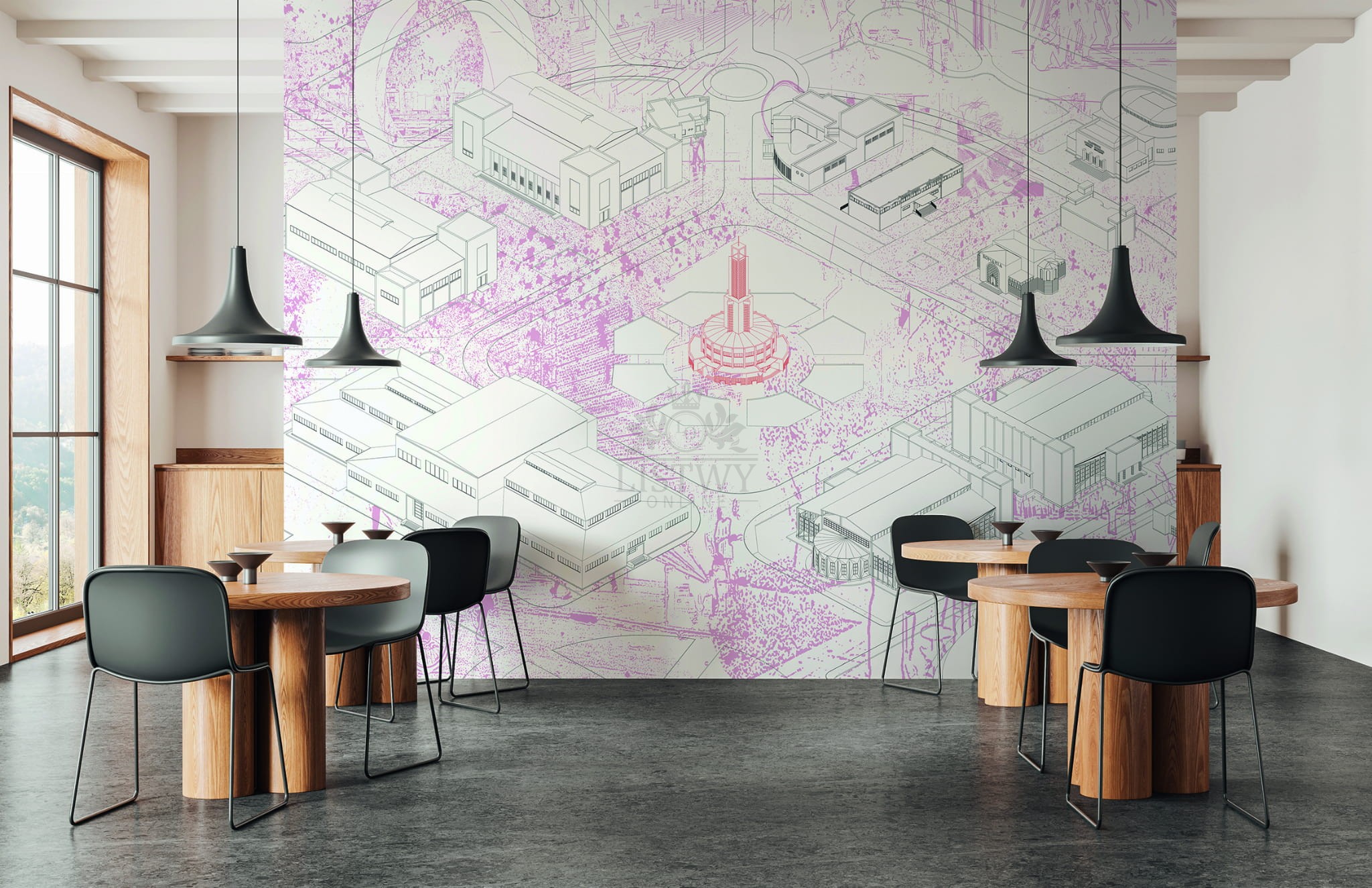 Mural wykonano w technologii druku cyfrowego — co zapewnia wysoką rozdzielczość, wyraźne detale i żywe kolory. Dzięki temu motyw graficzny — inspirowany miejską architekturą i nowoczesnym designem — prezentuje się z dużą głębią, a przejścia tonalne są subtelne i naturalne.